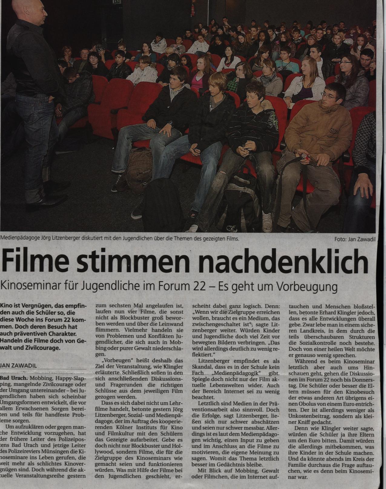 Gewalt hat viele Gründe und unterschiedliche Formen. Um die Jugendlichen zum Thema Gewalt und Zivilcourage zu sensibilisieren, wurden im Kino Bad Urach ausgewählte Filme gezeigt und besprochen. Vom IKF (Institut für Kino- und Filmkultur in Köln) wurde den Klassenlehrern Material zur Verfügung gestellt, um die Filme mit den Schülern vor- und ggf. nachzuarbeiten. Die Moderation im Kino wurde durch Medienpädagogen des IKF durchgeführt. Bei jeder Veranstaltung ist mindestens ein Polizeibeamter als Co-Moderator zugegen. Vom 16. bis 20.11.2009 wurden vom Polizeiposten Bad Urach und dem Polizeirevier Münsingen insgesamt 11 Vorstellungen in zwei Kinosälen durchgeführt. Der notwendige Bustransfer wurde von den Bürgermeistern der beteiligten Kommungen übernommen. Von den Schülern wird zur Deckung der Kosten ein kleiner Beitrag erhoben.