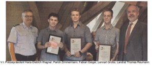 Den Mut Position zu beziehen zeigten Jugendliche aus Pliezhausen, die gegen die vorherrschende Stimmung im Saal couragiert ihre Meinung vertreten hatten. „Ihm tue es im Herzen weh, wenn die Grundwerte unserer Gesellschaft so mit Füßen getreten werden“, hatte beispielsweise Patrick Zimmermann gesagt. V.l. Polizeipräsident Hans-Dietrich Wagner, Parick Zimmermann, Fabian Geiger, Lennart Große, Landrat Thomas Reumann
