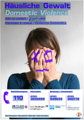 Plakataktion „Häusliche Gewalt“ in mehreren SprachenDerzeit sind die Einsatzzahlen bei Familienstreitigkeiten rückgängig. Dass durch die sinkende Arbeitslosigkeit die häusliche Gewalt so gesunken ist, ist nicht anzunehmen. Eine Dunkelfeldstudie des Innenministeriums Niedersachsen zeigt auf, dass nur 5,7% der Opfer von häuslicher Gewalt die Polizei einschalten. Der extreme Rückgang der Wohnungsverweise ist daher nicht als einen Rückgang der Gewalt zu interpretieren. Einer Plakat-Aktion will die Bevölkerung, Betroffene und Multiplikatoren auf das Thema häusliche Gewalt aufmerksam machen und insbesondere Menschen dazu ermutigen, sich Hilfe zu holen. Dabei soll der Wohnungsverweis als Mittel wieder mehr Bekanntheit erlangen. Tausend Plakate im Reutlinger Stadtgebiet sollen aufzeigen, wo Frauen anrufen können, die Opfer häuslicher Gewalt geworden sind.